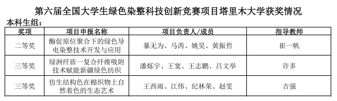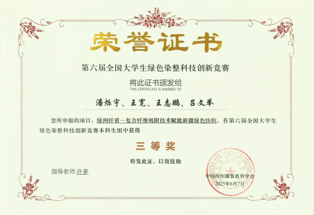 在为期三天的决赛中,我院参赛团队聚焦绿色染整、智能纺织等领域,展开角逐。获奖项目"酶促原位聚合下的绿色导电染整技术开发与应用"(二等奖)创新性地将生物催化与原位聚合相结合、电导率比传统酶促聚合提升2个数量级的显著成效;“仿生结构色在棉织物上自然着色的生态艺术”和“绿洲纤盾—复合纤维吸附技术赋能新疆绿色纺织”(三等奖)项目成功开发出绿色结构生色技术和清洁型吸附材料。这些成果充分体现了我院"新工科"建设背景下"产学研用"协同创新的培养模式成效。该赛事对推动绿色染整技术创新发展、助力纺织专业新工科人才培养具有重要价值,为行业注入了蓬勃的创新活力。